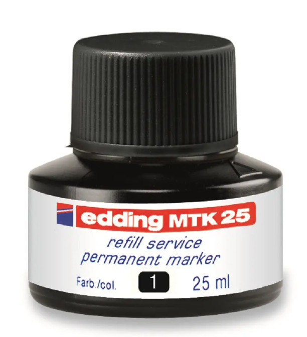 Atrament slabého zápachu s kapilárnym systémom na dopĺňanie permanentných popisovačov edding 2000/-2000 C, 2200/-2200 C, 400, 300, 330 a 370. Obsah 25 ml. Tento chemický prípravok je nebezpečný. Pri dopĺňaní vložte prednú časť popisovača špičkou do fľaštičky a po niekoľkých minútach bude popisovač pripravený k opätovnému použitiu. Obsah 25 ml.