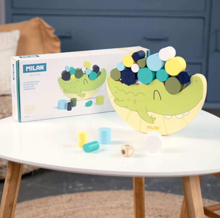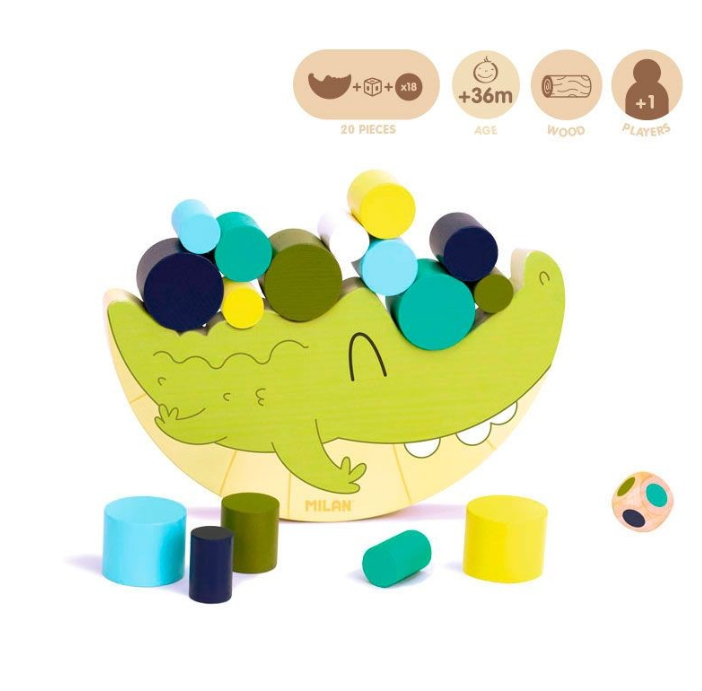 - obsahuje balančnú figúrku v tvare krokodíla, kocku a 18 valcových dielikov