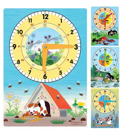 Školské hodiny A4 s rozprávkovými motívmi. Farebné ručičky pre lepšie vnímanie. Na hodinách je znázornený: 24 hodinový, 12-hodinový čas + minúty + vyobrazené štyri ročné obdobia.