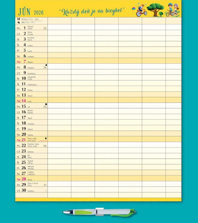 Tento praktický kalendár ponúka veľa priestoru na zapisovanie aktivít celej domácnosti – každý člen si nájde svoj stĺpec! Každý mesiac je navyše doplnený o ilustrácie, motta. Súčasťou balenia sú aj samolepky s emotikonmi a piktogramami, ktorými si môžete jednoducho vyjadriť svoje činnosti, pocity a emócie – hravo a prehľadne. Kalendár obsahuje aj pero. Ideálny pomocník pre organizovanú a hravú domácnosť!