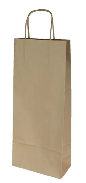 Darčeková taška z hnedého papiera, vhodná na fľašu. Hladká. Rozmery: 140 x 80 x 390 mm.