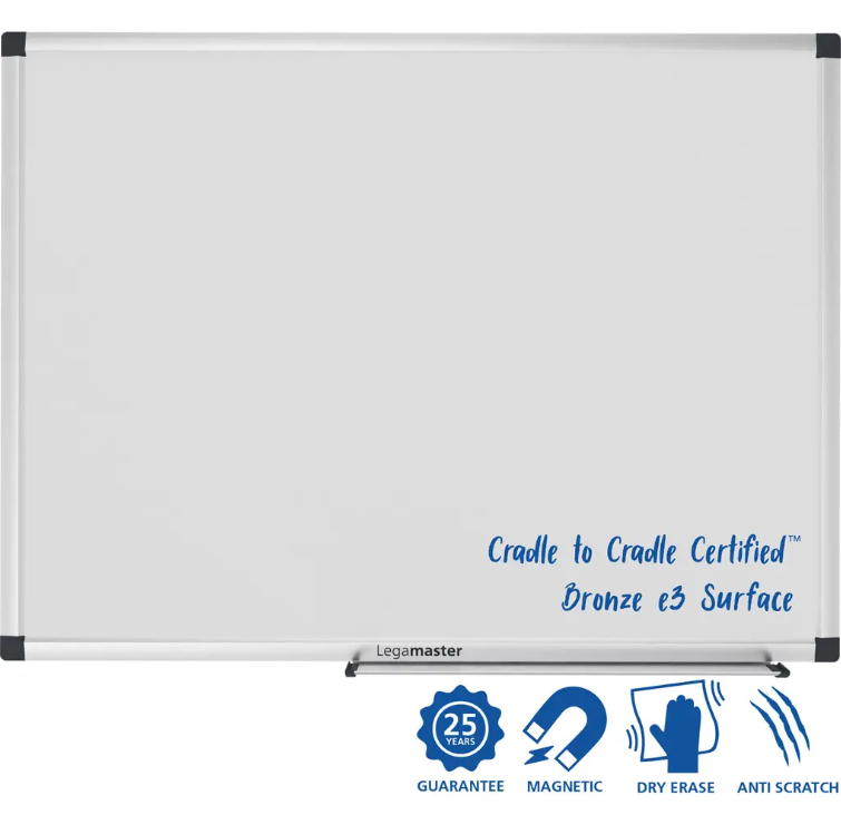 Robustná a udržateľná tabuľa na časté používanie v kancelárii, triede alebo v priemyselnom prostredí. Vhodná na písanie fixkami na tabuľu stierateľnými za sucha. Magnetický smaltovaný oceľový povrch s použitím e3 Ceramic Steel, ktorá má certifikáciu Cradle to Cradle Certified™ na úrovni bronzu. Hliníkový rám so sivými plastovými rohovými krytkami (Pantone 433C). Možno namontovať horizontálne alebo vertikálne. Vrátane držiaka popisovačov (30 cm), montážnej sady a montážneho návodu. Rozmery: 45 x 60 cm.