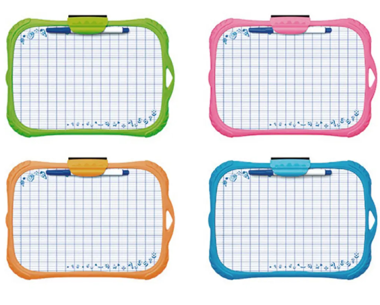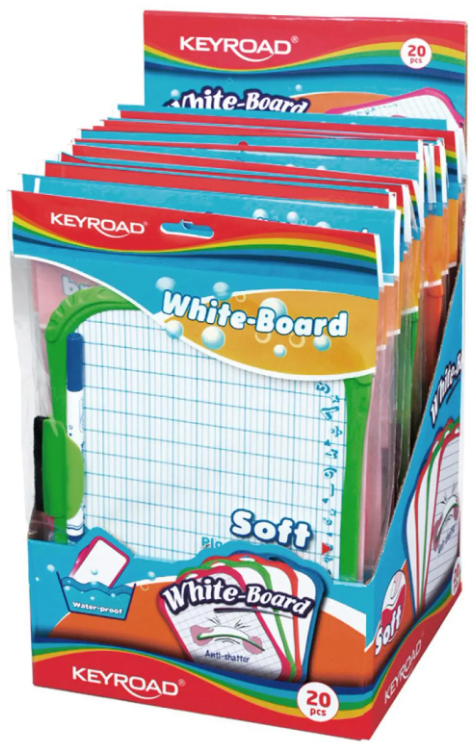 Tabuľka KEYROAD Mini na sucho stierateľná, obojstranná (hladká/kockovaná). Protipráskavý náter, flexi, umývateľný, farebné gumené rámy. Fixka a mini hubka súčasťou balenia. Závesná konzola, rozmer: 205 x 287 x 17mm. Farba dosky: biela, farba rámu: mix farieb.