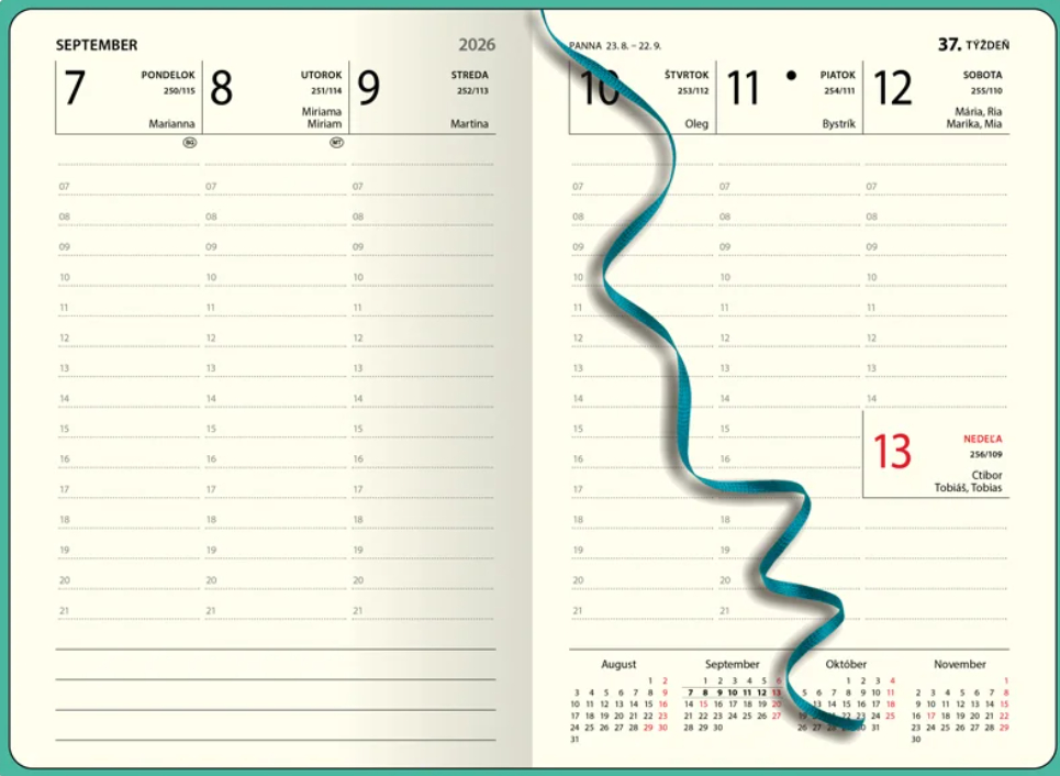 Jedinečný týždenný diár potiahnutý kvalitným termocitlivým poťahom. Diár je v pevnej väzbe s prednou penovou doskou, farebnou gumičkou, pútkom na pero a praktickým vreckom. Slovenské prehľadné kalendárium.
