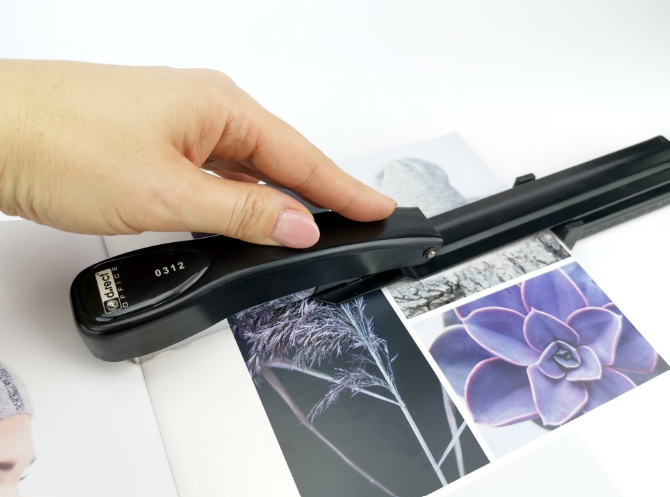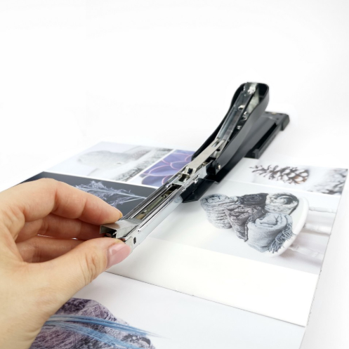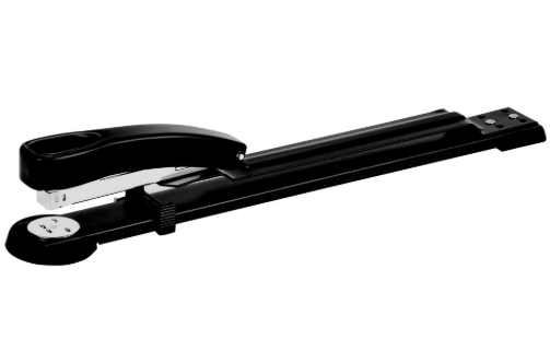 Robustná kovová dlhoramenná zošívačka s hĺbkou zasunutia papiera až 314 mm. Na základni sa nachádzajú dve stupnice dĺžky: v palcoch a centimetroch. Je vybavená dorazom hĺbky zošívania.